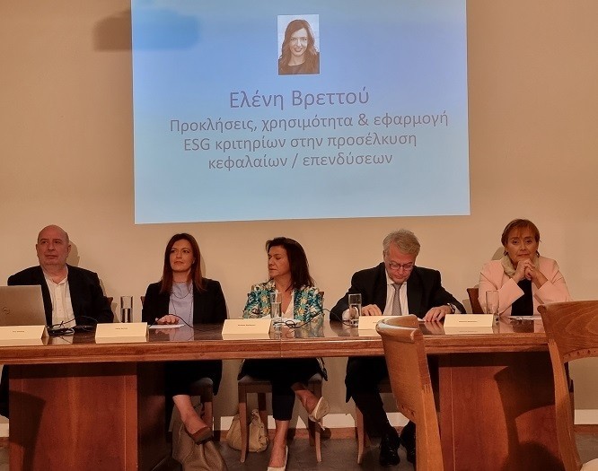 Η κ. Βρεττού επισήμανε ότι το ESG θεσμικά έχει επιβληθεί, χρηματοδοτικά κεφάλαια υπάρχουν, ωστόσο θα πρέπει οι επιχειρήσεις να επενδύσουν, ώστε να αποτελέσει μέρος της κουλτούρας και του DNA τους.