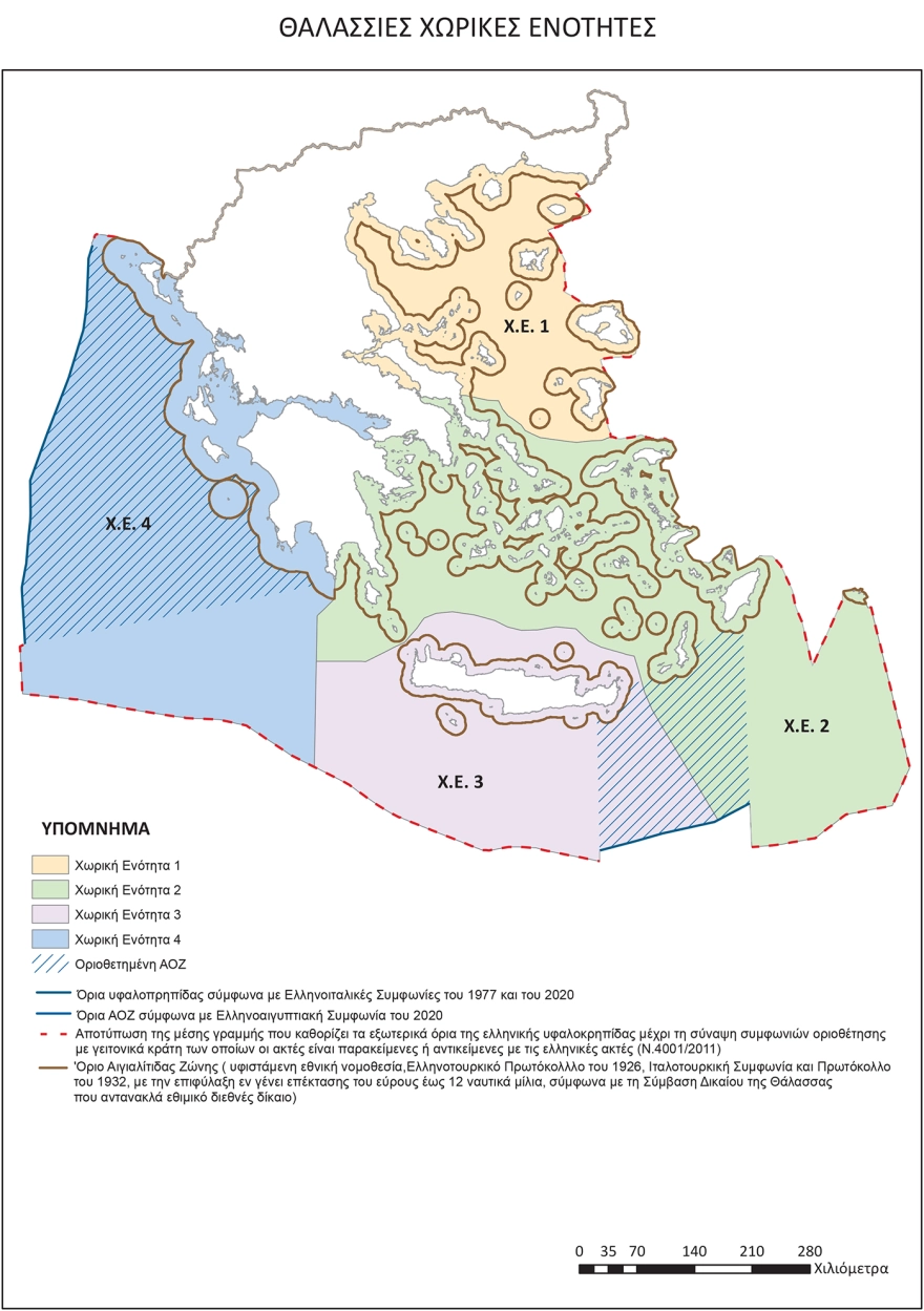 Ο θαλάσσιος χωροταξικός σχεδιασμός χωρίζεται σε τέσσερις χωρικές ενότητες και καθορίζει τα όρια της υφαλοκρηπίδας σύμφωνα με τις ελληνοϊταλικές συμφωνίες του 1977 και του 2020.