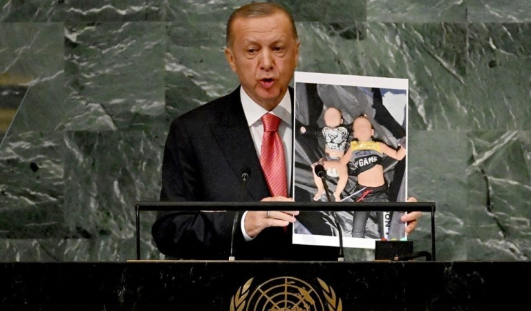 Ο Τούρκος πρόεδρος μιλώντας στην ετήσια συνέλευση του ΟΗΕ έδειξε ακόμα και φωτογραφίες με νεκρά βρέφη και ισχυρίστηκε ότι αυτό είναι το αποτέλεσμα των βίαιων επαναπροωθήσεων από το ελληνικό λιμενικό.