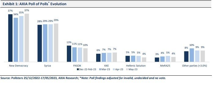 Σε κάθε περίπτωση, πάντως, η AXIA πιστεύει ότι η Ν.Δ. θα επιδιώξει δεύτερες εκλογές, αν καταφέρει να επιτύχει μια ισχυρή επίδοση στις εκλογές της 21ης Μαΐου.