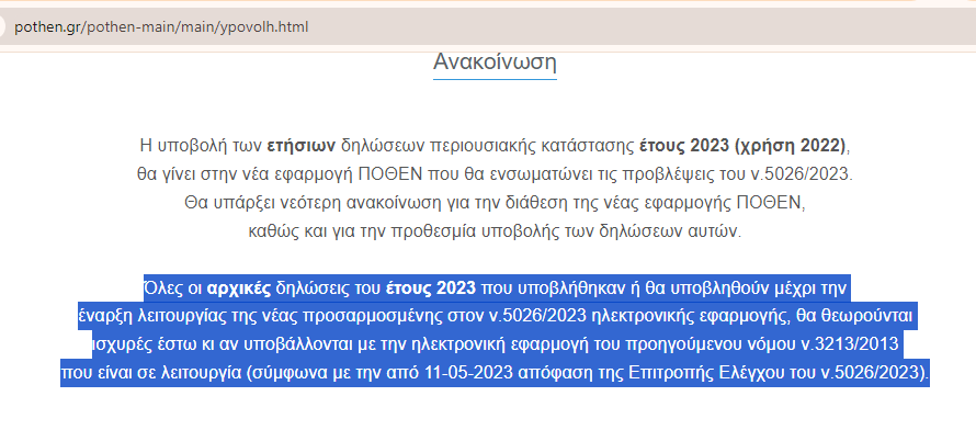 “Όλες οι αρχικές δηλώσεις του έτους 2023 που υποβλήθηκαν ή θα υποβληθούν μέχρι την έναρξη λειτουργίας της νέας προσαρμοσμένης στον ν.5026/2023 ηλεκτρονικής εφαρμογής, θα θεωρούνται ισχυρές έστω κι αν υποβάλλονται με την ηλεκτρονική εφαρμογή του προηγούμενου νόμου ν.3213/2013 που είναι σε λειτουργία (σύμφωνα με την από 11-05-2023 απόφαση της Επιτροπής Ελέγχου του ν.5026/2023)”. Και… για όποιον δεν κατάλαβε, ο κύριος Κασσελάκης μπορούσε να υποβάλει αρχική δήλωση «κανονικά και με το νόμο» εδώ και πολλούς μήνες.