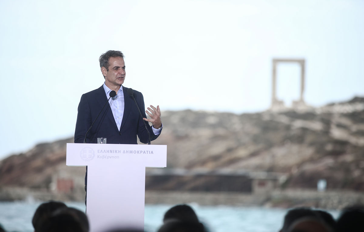 Χρόνια πολλά στη Νάξο, η οποία γιορτάζει σήμερα, και είναι μεγάλη η χαρά και ευτυχής η συγκυρία, αγαπητέ μου Δήμαρχε, Ναξιώτισσες και Ναξιώτες, που βρισκόμαστε σήμερα σε αυτό το τόσο όμορφο νησί, μπροστά στο μοναδικό τοπόσημο της Νάξου, όχι μόνο για να γιορτάσουμε μαζί σας τον πολιούχο της πόλης αλλά και για να ανακοινώσουμε την υπογραφή ενός πολύ σημαντικού χρηματοδοτικού εργαλείου για τα νησιά μας.