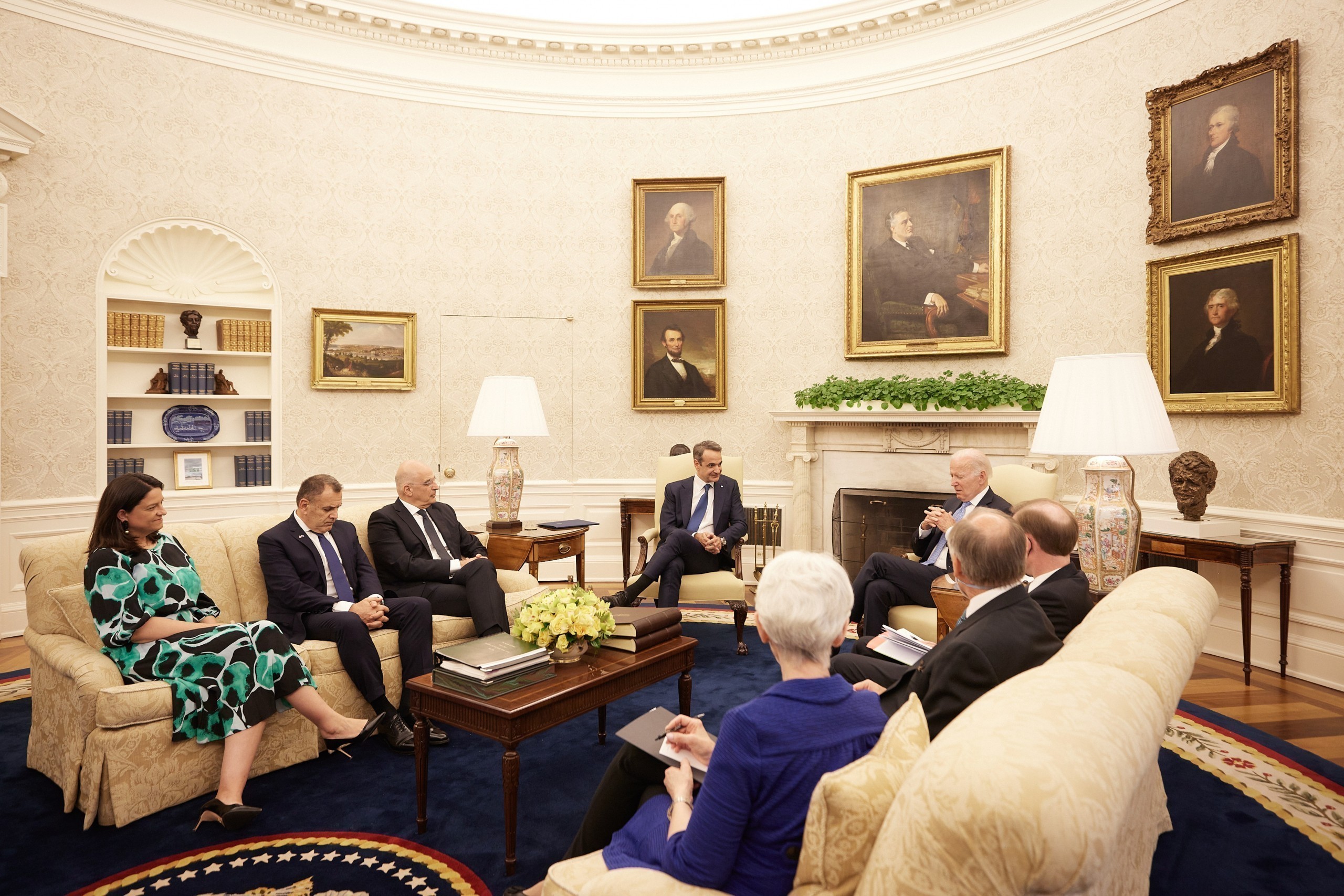 Μία ευρεία γκάμα θεμάτων διμερούς, περιφερειακού αλλά και διεθνούς ενδιαφέροντος ετέθησαν επί τάπητος κατά την κατ’ ιδίαν συνάντηση του πρωθυπουργού, Κυριάκου Μητσοτάκη με τον Αμερικανό πρόεδρο, Τζο Μπάιντεν, αλλά και εν συνεχεία στις διευρυμένες συνομιλίες ανάμεσα στις δύο αντιπροσωπείες.