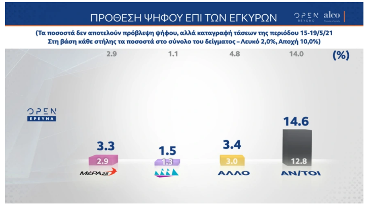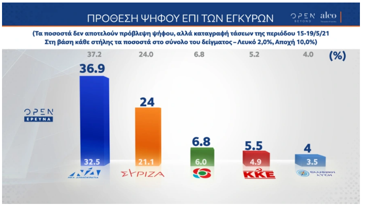 Η ΝΔ εξακολουθεί να διατηρεί μία διαφορά 12,9 ποσοστιαίων μονάδων (μειωμένη μόλις κατά 0,3% από την προηγούμενη μέτρηση της ίδιας εταιρίας), άρα οι συσχετισμοί παραμένουν ουσιαστικά αμετάβλητοι: η Νέα Δημοκρατία έχει 36,9%, ο ΣΥΡΙΖΑ 24%, το ΚΙΝΑΛ 6,8%, το ΚΚΕ 5,5%, η Ελληνική Λύση 4% και το ΜέΡΑ25 3%.