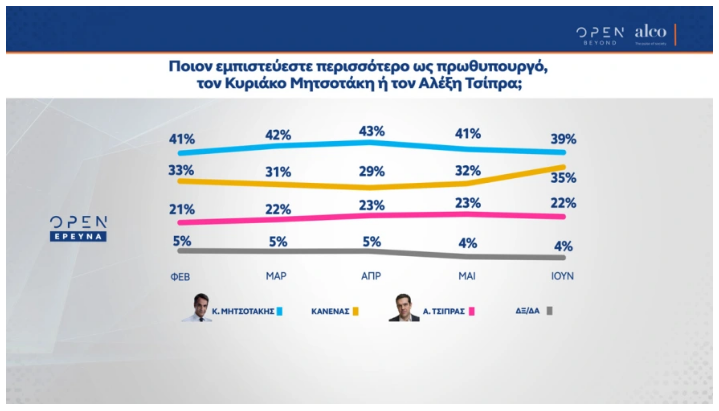 Την ίδια πολιτική κυριαρχία απολαμβάνει και ο Κυριάκος Μητσοτάκης έναντι του Αλέξη Τσίπρα (39% έναντι 22%).