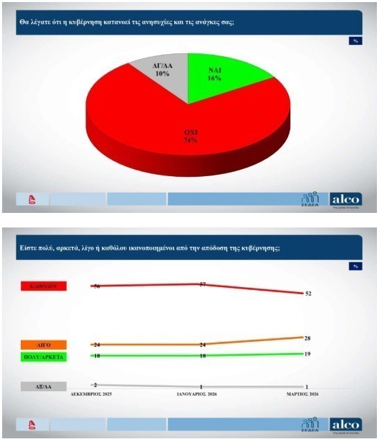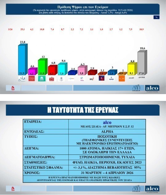 Την εικόνα μίας καθαρής, αλλά σχετικά μικρής δημοσκοπικής πτώσης για τη ΝΔ μετά τη νέα δικογραφία της υπόθεσης του ΟΠΕΚΕΠΕ έδωσε η ALCO στην μέτρηση που παρουσιάστηκε στο κεντρικό δελτίο του Alpha. Το κυβερνών κόμμα μετρήθηκε στο 21,9% στην «καθαρή» πρόθεση ψήφου και στο 23,8% επί των εγκύρων – και διατηρεί μεγάλο προβάδισμα 11,9 μονάδων σε σχέση με το ΠΑΣΟΚ που εμφανίζει οριακά κέρδη και ανεβαίνει στο 12% στην πρόθεση ψήφου επί των εγκύρων.