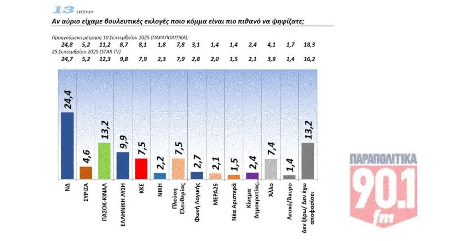 Στην πρόθεση ψήφου η ΝΔ κινείται στο 24,4% και ακολουθούν το ΠΑΣΟΚ με 13,2%, η Ελληνική Λύση με 9,9% ενώ στην τέταρτη ισοβαθμούν η Πλεύση Ελευθερίας και το ΚΚΕ με 7,5%. Ο ΣΥΡΙΖΑ αποτυπώνεται στο 4,6%, με 2,7% η Φωνή Λογικής, με 2,4% το Κίνημα Δημοκρατίας, με 2,1% το ΜεΡΑ25 και με 1,5% η Νέα Αριστερά.