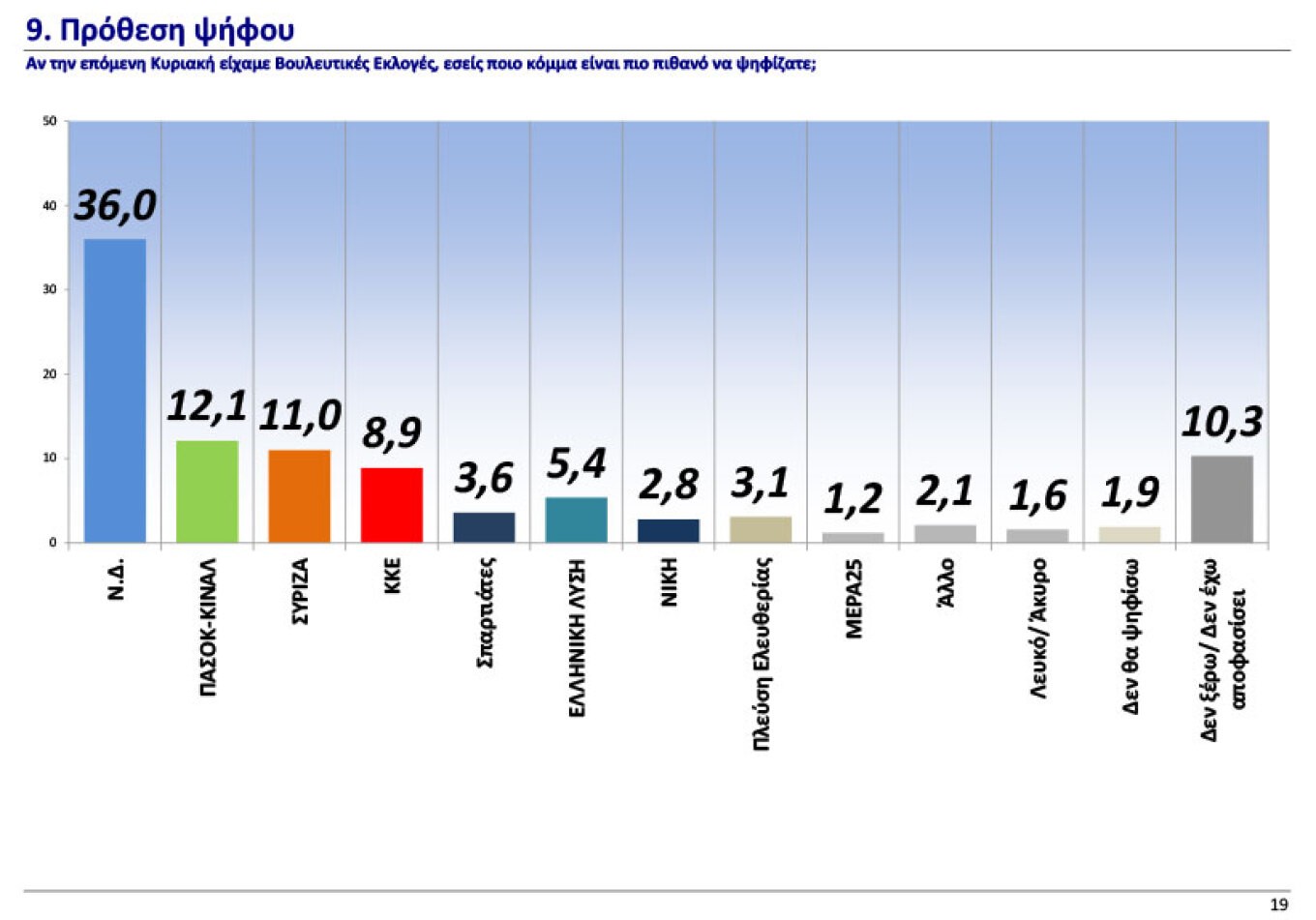 Αναλυτικά, η Νέα Δημοκρατία στην πρόθεση ψήφου συγκεντρώνει 36% και ακολουθούν το ΠΑΣΟΚ με 12,1% και ο ΣΥΡΙΖΑ με 11%. Στα άλλα κόμματα, το ΚΚΕ συγκεντρώνει 8,9%, η Ελληνική Λύση 5,4%, η Νίκη 2,8%, η Πλεύση Ελευθερίας 3,1%, το ΜέΡΑ25 1,2%, οι Σπαρτιάτες 3,6%, ενώ στο 10,3% είναι οι αναποφάσιστοι.