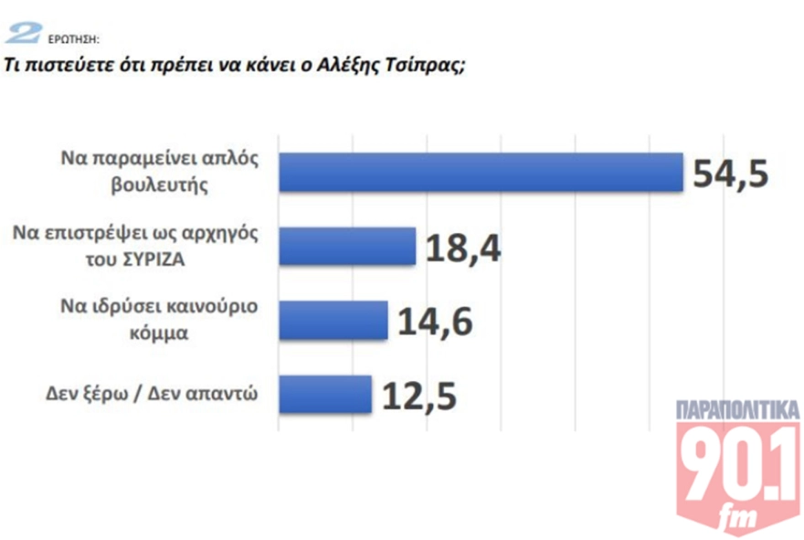 Ως προς τον Αλέξη Τσίπρα πάνω από τους μισούς (54,5%) λένε ότι πρέπει να παραμείνει απλός βουλευτής, με ένα 18,4% να ζητούν επιστροφή του ως αρχηγός του ΣΥΡΙΖΑ και ένα 14,6% να τάσσεται υπέρ της ίδρυσης καινούργιο κόμματος.