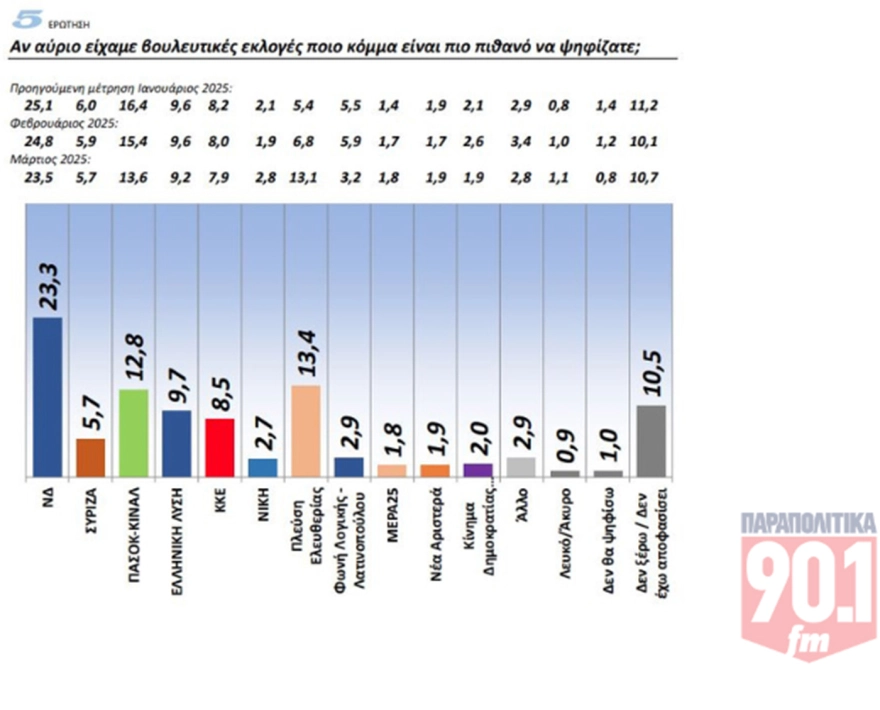 Στο ερώτημα «αν αύριο είχαμε βουλευτικές εκλογές, ποιο κόμμα είναι πιο πιθανό να ψηφίζατε», η ΝΔ είναι στην πρώτη θέση με 23,3%, ακολουθεί η Πλεύση Ελευθερίας με 13,4% και στην τρίτη θέση είναι το ΠΑΣΟΚ με 12,8%.