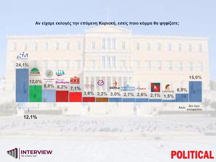 Πρωτιά της ΝΔ με double score από το δεύτερο ΠΑΣΟΚ αποτυπώνει δημοσκόπηση της Interview για λογαριασμό της εφημερίδας Political με την Πλεύση Ελευθερίας να υποχωρεί στην τέταρτη θέση.