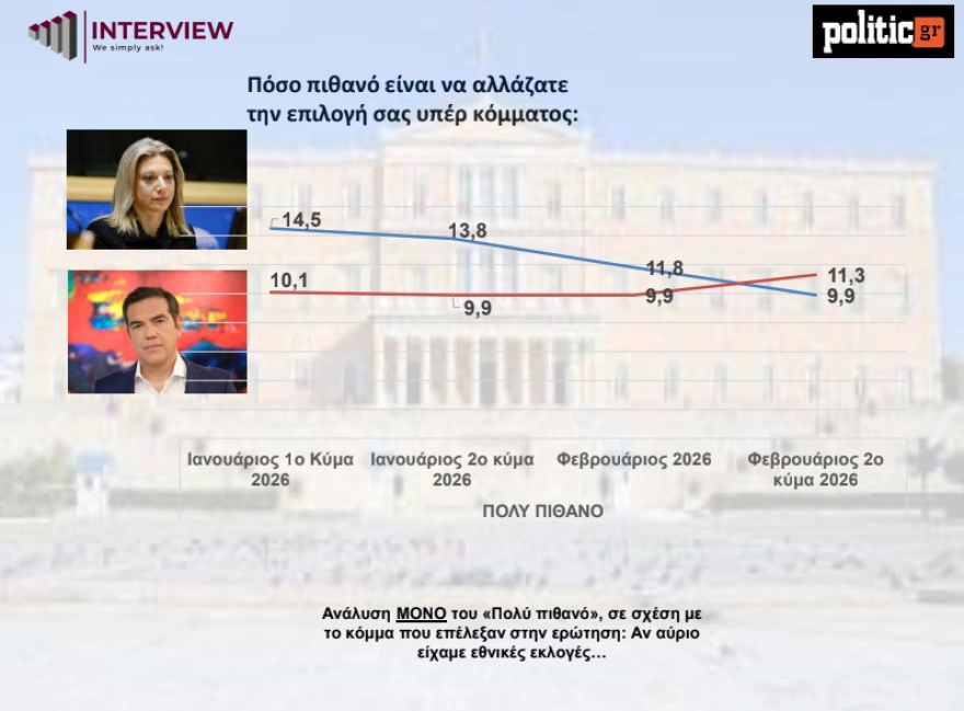 Στο 31,6% μετρά τη Νέα Δημοκρατία στην εκτίμηση εκλογική αποτελέσματος δημοσκόπησης της Interview για την ιστοσελίδα Politic.gr, με τον Κυριάκο Μητσοτάκη να επιλέγεται ξανά ως ο καταλληλότερος για πρωθυπουργός και τον Αλέξη Τσίπρα να προσπερνά τη Μαρία Καρυστιανού στο ερώτημα πόσο πιθανό είναι να αλλάζατε την επιλογής σας υπέρ ή ενός κόμματος του πρώην πρωθυπουργού ή ενός κόμματος της πρώην προέδρου του συλλόγου των θυμάτων από τα Τέμπη.