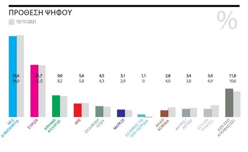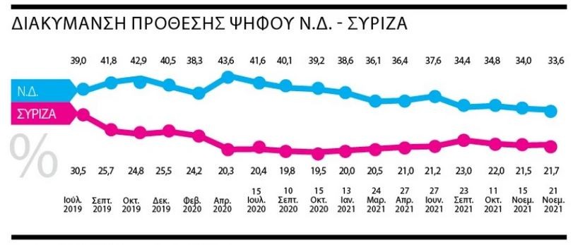 Η δύναμη του κυβερνώντος κόμματος που έφτασε στο απώγειό της τον Απρίλιο του 2020 όταν, υπό το κράτος της θετικής εξέλιξης που είχε η διαχείριση της πανδημίας και της σθεναρής αντίδρασης που βρήκε η «υβριδική» απειλή της Αγκυρας στον Εβρο, εκτινάχθηκε στο εντυπωσιακό 43,6%, φαίνεται ότι πλέον προσγειώνεται σε αναμενόμενα επίπεδα της τάξης του 33,6%.