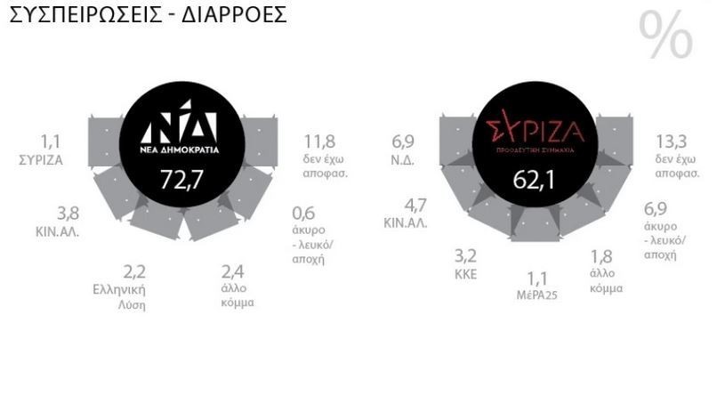 Το κόμμα του Αλέξη Τσίπρα παρουσιάζει μειωμένη συσπείρωση της τάξης του 62,1%, ποσοστό που είναι 10 εκατοστιαίες μονάδες κάτω από την αντίστοιχη επίδοση της παράταξης του Κυριάκου Μητσοτάκη που συγκρατεί το 72,7% όσων την ψήφισαν στις τελευταίες κάλπες. Πέραν τούτου, η απόσταση των δύο κομμάτων μεγαλώνει και εξαιτίας του «δούναι και λαβείν» ανάμεσα στα δύο κόμματα εξουσίας. Η Νέα Δημοκρατία αποσπά το 6,9% των ψηφοφόρων του ΣΥΡΙΖΑ έναντι μόλις του 1,1% των ψηφοφόρων του κυβερνώντος κόμματος που αποσπά η αξιωματική αντιπολίτευση.