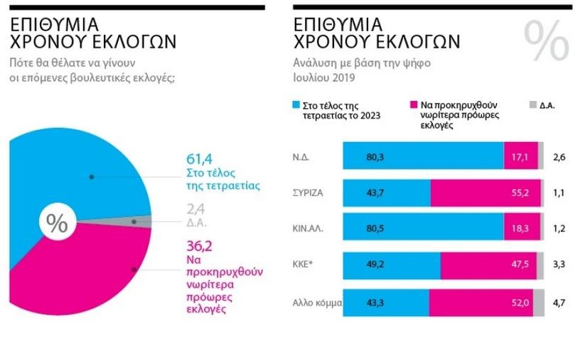 Η πλειονότητα των πολιτών, πάντως, εμφανίζεται να τάσσεται υπέρ της υφιστάμενης σταθερότητας, καθώς σχεδόν έξι στους δέκα (ή ποσοστό 61,4%) θέλουν να ολοκληρώσει τη θητεία της η σημερινή κυβέρνηση και μόνον ένας στους τρεις (36,2%) επιθυμεί πρόωρες εκλογές. Είναι χαρακτηριστικό άλλωστε ότι το 43,7% των ψηφοφόρων του ΣΥΡΙΖΑ θέλει εξάντληση της τετραετίας, ποσοστό που στους νεοδημοκράτες αλλά και στους φίλους του Κινήματος Αλλαγής ξεπερνά το 80%.