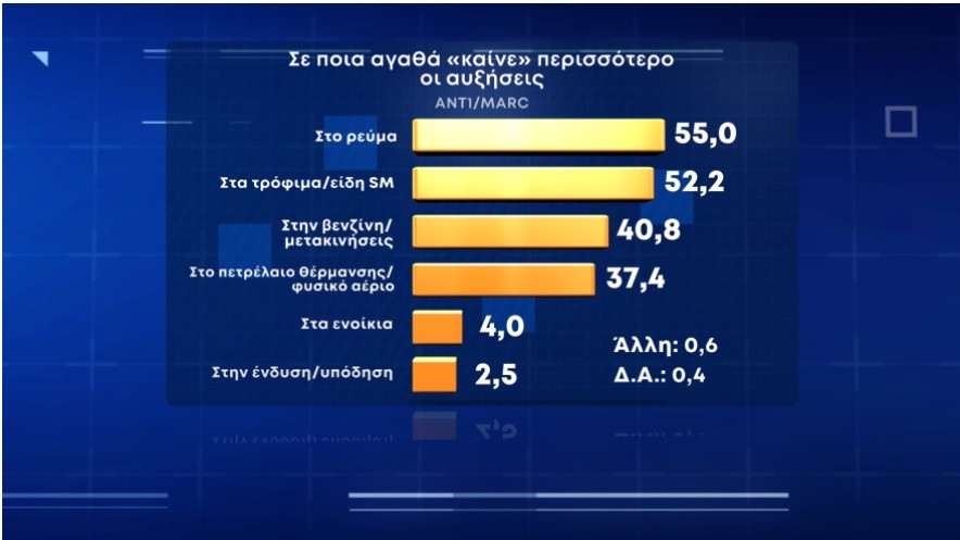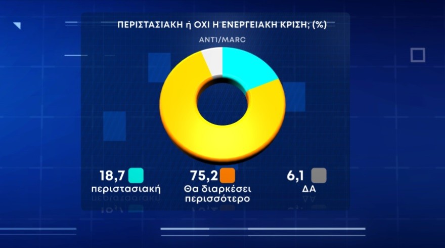 Η κρίση δεν είναι περιστασιακή θεωρεί το 75,2% και όπως φαίνεται από τους σχετικούς πίνακες ο μεγαλύτερος πονοκέφαλος για τους πολίτες είναι οι αυξήσεις στο ρεύμα 55% και ακολουθούν στη σειρά κατάταξης τα τρόφιμα με 52,2%, τα καύσιμα με 40,8% και το πετρέλαιο θέρμανσης και το φυσικό αέριο με 37,4%.