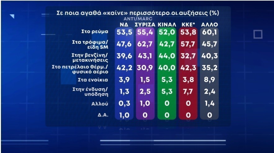Το ρεύμα είναι αυτό που καίει περισσότερο τους ψηφοφόρους της ΝΔ 53,5% και του ΚΙΝΑΛ 52%, ενώ τους ψηφοφόρους του ΣΥΡΙΖΑ και του ΚΚΕ οι αυξήσεις στα τρόφιμα με ποσοστό 62,7% και 57,7% αντίστοιχα.