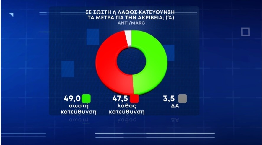 Η κοινή γνώμη είναι διχασμένη σε ό,τι αφορά τα μέτρα που έχουν ληφθεί για την ακρίβεια με το 49% να δηλώνει ότι κινούνται σε θετική κατεύθυνση και το 47,5% σε λάθος.