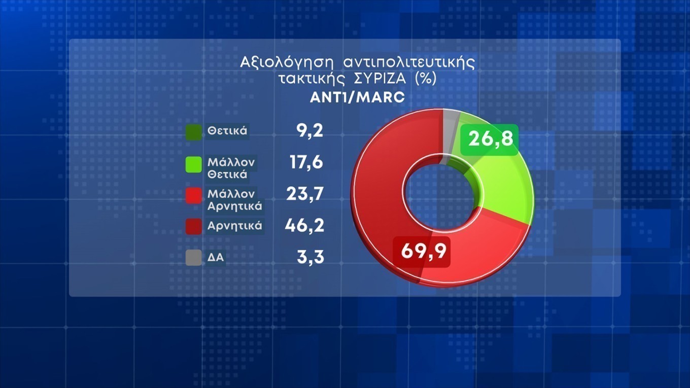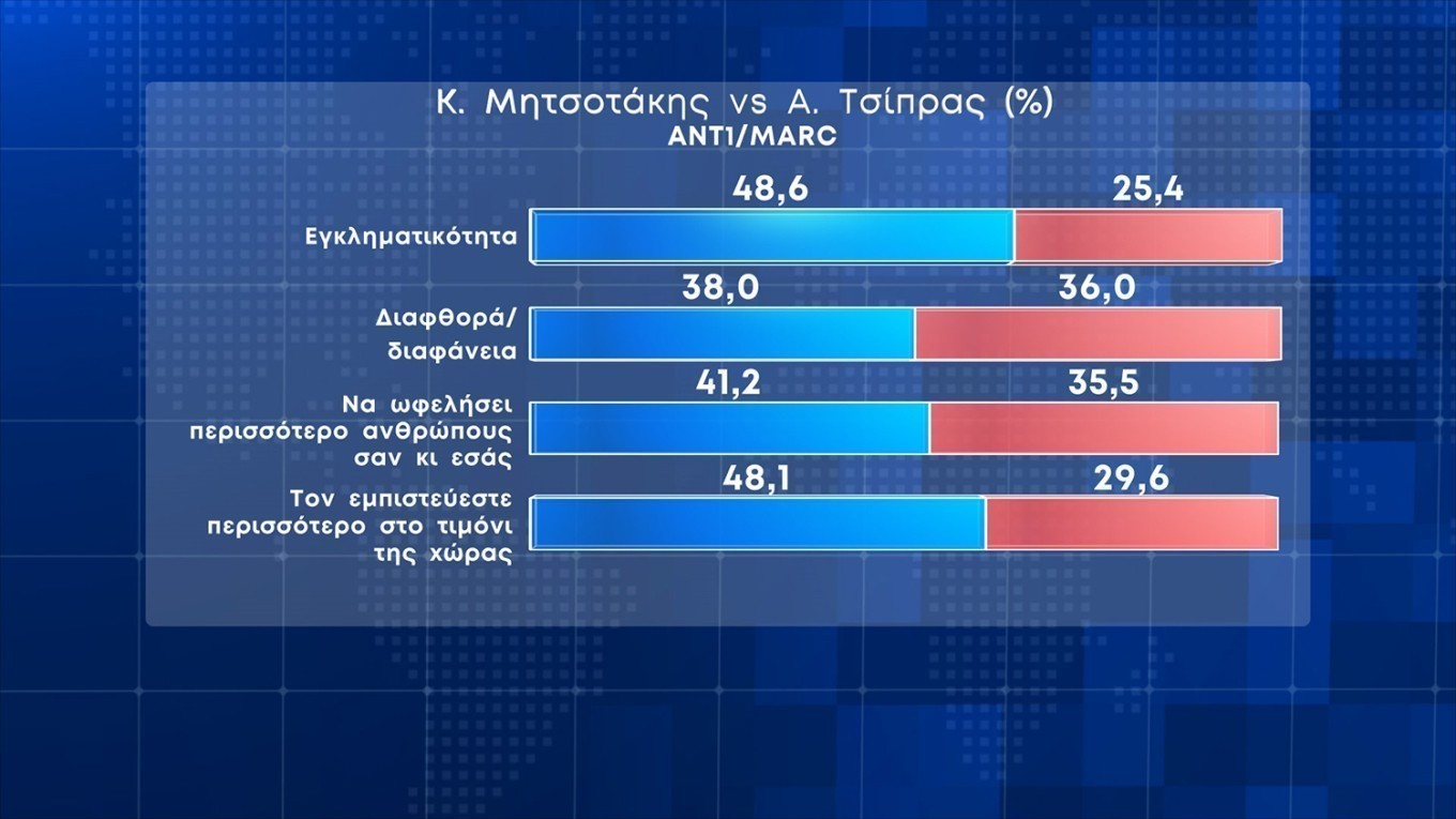 Σαφές προβάδισμα 8 μονάδων διατηρεί η Νέα Δημοκρατία έναντι του ΣΥΡΙΖΑ σε νέα δημοσκόπηση της εταιρείας MARC που παρουσιάστηκε απόψε στο Κεντρικό Δελτίο Ειδήσεων του ΑΝΤ1.