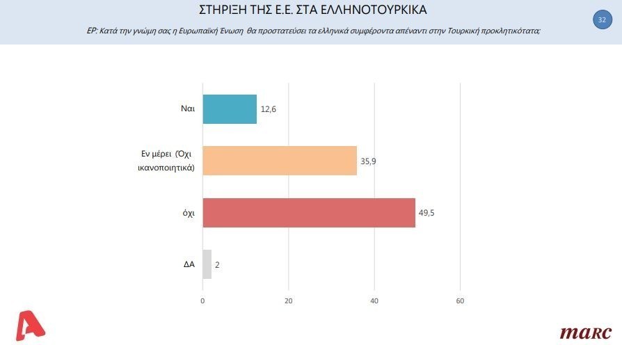 Παράλληλα, ένας στις δύο πολίτες δεν θεωρεί ικανοποιητική τη στήριξη προς την χώρα μας από την Ευρωπαϊκή Ένωση στο θέμα των ελληνοτουρκικών.