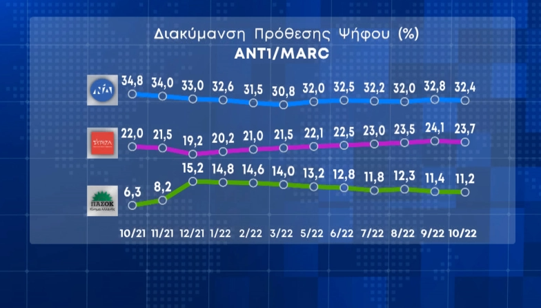 Στην πρόθεση ψήφου η Νέα Δημοκρατία συγκεντρώνει 32,4%, ο ΣΥΡΙΖΑ 23,7%, το ΠΑΣΟΚ 11,2%, το ΚΚΕ 5,2%, η Ελληνική Λύση 4,4% και το ΜέΡΑ 25 3,1%.