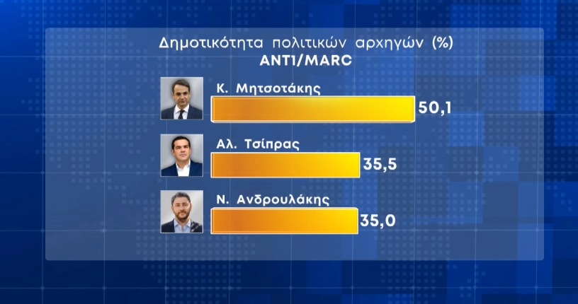 Στη δημοτικότητα των πολιτικών αρχηγών ο Κυριάκος Μητσοτάκης συγκεντρώνει 50,1%, ο Αλέξης Τσίπρας 35,5% και ο Νίκος Ανδρουλάκης 35%.