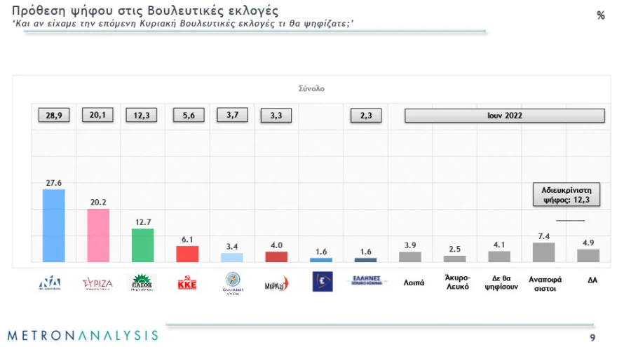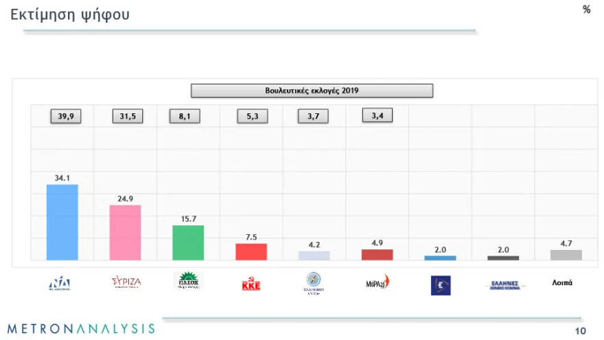 Ειδικότερα, η διαφορά μεταξύ της Νέας Δημοκρατίας και του ΣΥΡΙΖΑ διαμορφώνεται στις 7,4 μονάδες στην πρόθεση ψήφου, ενώ ανεβαίνει στις 9,2 μονάδες στην εκτίμηση ψήφου: η ΝΔ καταγράφει 34,1%, ο ΣΥΡΙΖΑ 24,9%, το ΠΑΣΟΚ/ΚΙΝΑΛ 15,7% , το ΚΚΕ 7,5% , η Ελληνική Λύση 4,2% και το κόμμα Βαρουφάκη 4,9%. Το 35% έχει θετική εικόνα για την κυβέρνηση και το 38% θετική εικόνα για τον πρωθυπουργό, παρότι το 60% δηλώνει ότι η χώρα πηγαίνει σε λάθος κατεύθυνση.