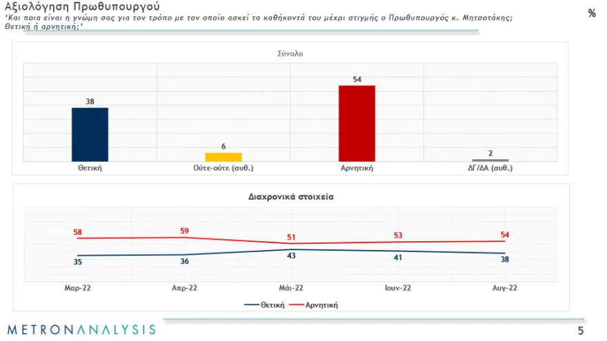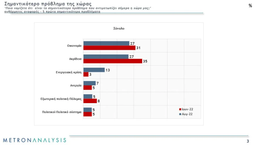 Λίγο πριν από τη φετινή Διεθνή Έκθεση Θεσσαλονίκης- όπου ο πρωθυπουργός θα παρουσιάσει το σχέδιο της κυβέρνησης για τον δύσκολο χειμώνα και την «επόμενη μέρα»- η κυβερνητική παράταξη καταγράφει σημαντικό προβάδισμα 9,2 μονάδων στην εκτίμηση ψήφου και ένα θετικό «αποτύπωμα» παρά την διαχείριση των εμποδίων που φέρνει η ενεργειακή κρίση. Στη δημοσκόπηση συγκεκριμένα της Metron Analysis που παρουσιάστηκε χθες στο κεντρικό δελτίο του Mega, το εκλογικό σώμα εμφανίζει για άλλη μια φορά έντονο ενδιαφέρον για την εξέλιξη της οικονομίας και την διαχείριση της ακρίβειας και της ενεργειακής κρίσης- παρατηρεί αλλά δεν «στέκεται» τόσο σε ζητήματα, όπως αυτό που προέκυψε με την παρακολούθηση του Νίκου Ανδρουλάκη από την ΕΥΠ.