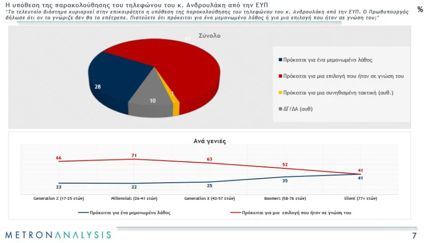 Στο ίδιο δημοσκοπικό πλάνο, ο Κυριάκος Μητσοτάκης καταγράφει απώλειες στο κεντρώο και στο κεντροδεξιό ακροατήριο, μετά από την υπόθεση της παρακολούθησης του κινητού του Νίκου Ανδρουλάκη, αλλά η δημοτικότητά του παραμένει σε πολύ υψηλά επίπεδα. Ένα ακόμη ενδιαφέρον στοιχείο σχετικά με την απήχηση του πρωθυπουργού στο εκλογικό σώμα συνδέεται με το ότι ο κ. Μητσοτάκης εμφανίζει λιγότερες αρνητικές γνώμες σε σχέση με τον Μάρτιο και τον Απρίλιο, όταν στην επικαιρότητα κυριαρχούσε το θέμα του πολέμου στην Ουκρανία. Κι αυτό παρά το γεγονός ότι σημαντικά κομμάτια της κοινής γνώμης – πάνω από 60% στις νεότερες ηλικίες και από 41% ως 63% στις μεγαλύτερες ηλικίες- δηλώνουν ότι η παρακολούθηση Ανδρουλάκη ήταν μία επιλογή την οποία γνώριζε.