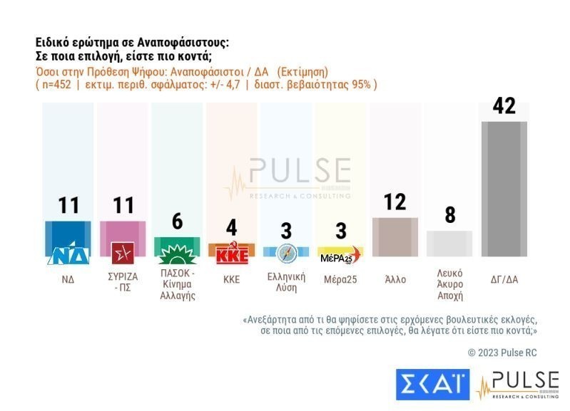 Όπως προκύπτει από την μέτρηση, οι αναποφάσιστοι δηλώνουν ότι είναι πιο κοντά σε ΝΔ και ΣΥΡΙΖΑ σε ποσοστό 11% για το κάθε κόμμα. Το 6% δηλώνει πιο κοντά στο ΠΑΣΟΚ, ενώ ένας στους δύο παραμένει στην «γκρίζα ζώνη».