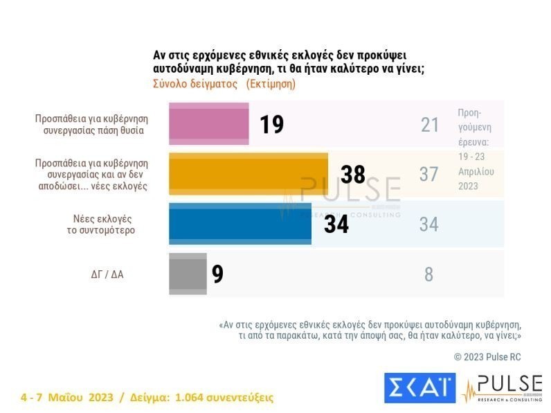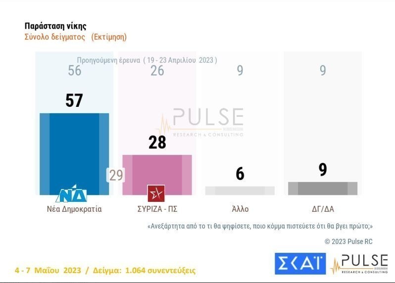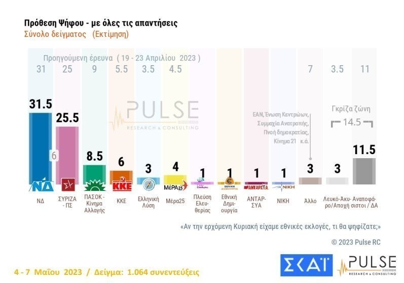 Έχει ενδιαφέρον ότι στο σενάριο αυτό, η Pulse «βλέπει» τη ΝΔ να κυμαίνεται από το 32,1% ως 37,9%, τον ΣΥΡΙΖΑ από το 25,7% ως το 31,3%, το ΠΑΣΟΚ από το 8,6% ως το 12,4%, το ΚΚΕ από το 5,4% ως το 8,6%, την Ελληνική Λύση από το 2,3% ως το 4,7%, το ΜεΡΑ25 από το 3,2% ως το 5,8% και τα κόμματα εκτός Βουλής από το 9,1% ως το 12,9%.