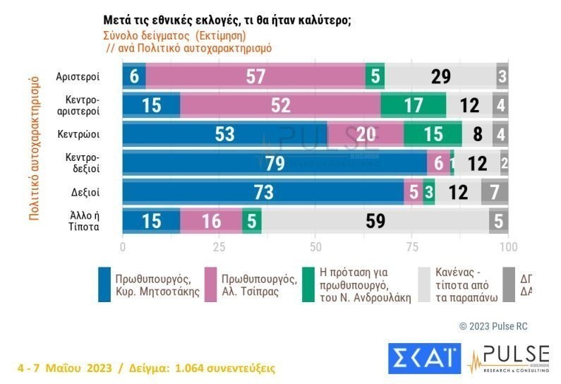 Πρωθυπουργό Μητσοτάκη επιλέγουν σε πολύ μεγάλο ποσοστό – πάνω από 70% – οι ψηφοφόροι που δηλώνουν δεξιοί ή κεντροδεξιοί, ενώ μεγάλο ρεύμα έχει ο πρωθυπουργός και στους ψηφοφόρους του Κέντρου. Σημαντικό προβάδισμα διατηρεί ο Αλέξης Τσίπρας μεταξύ των κεντροαριστερών και των αριστερών ψηφοφόρων.
