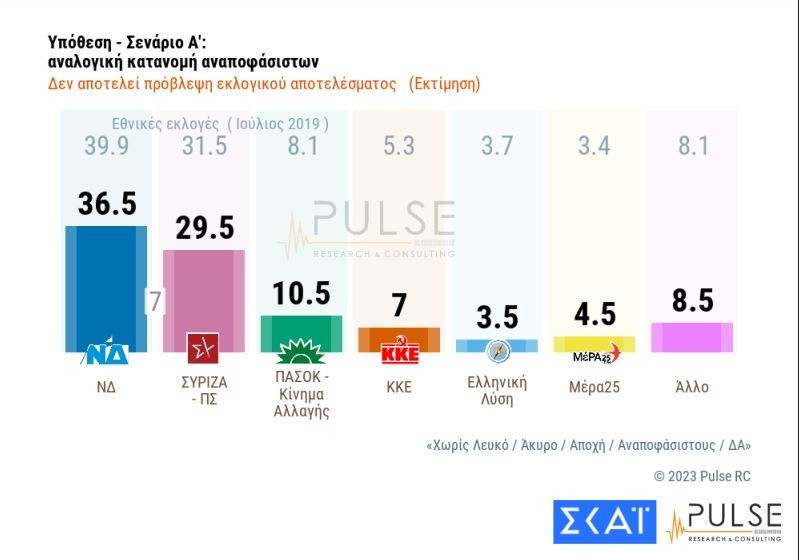 Με την κατανομή με βάση τις απαντήσεις των αναποφάσιστων, η ΝΔ βγάζει 35% και 118 έδρες, ο ΣΥΡΙΖΑ 28,5% και 96 έδρες, το ΠΑΣΟΚ 10,5% και 35 έδρες, το ΚΚΕ 7% και 24 έδρες, η ελληνική Λύση 3,5% και 12 έδρες και το ΜεΡΑ25 4,5% με 14 έδρες, ενώ το ποσοστό των κομμάτων εκτός Βουλής εκτοξεύεται στο 11%.