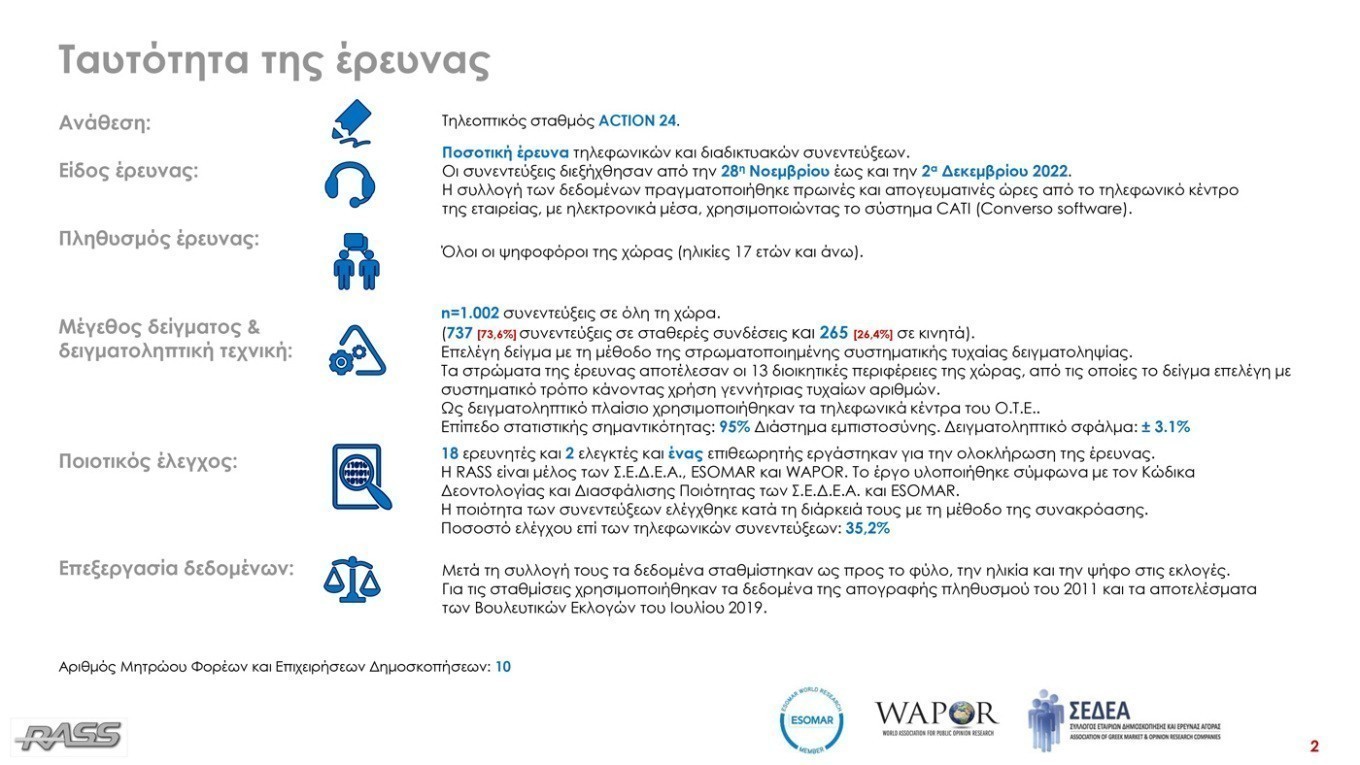 Σμειώνεται ότι – όπως καταγράφεται σε όλες τις δημοσκοπήσεις – έντονη είναι η ανησυχία των ψηφοφόρων για το οικονομικό τους μέλλον (79,3%). Ωστόσο, όπως σημειώνουν τα στελέχη της RASS, «παρά το γεγονός ότι τους απασχολεί η ακρίβεια, θεωρούν ότι οι ανατιμήσεις στην αγορά είναι πρωτίστως απότοκο της διεθνούς συγκυρίας (57,3%) και δευτερεύοντος ευθύνη της κυβέρνησης (41,7%), ενώ οι επτά στους δέκα δεν πιστεύουν ότι το καλάθι του νοικοκυριού σε αυτή τη φάση έχει αποδώσει.