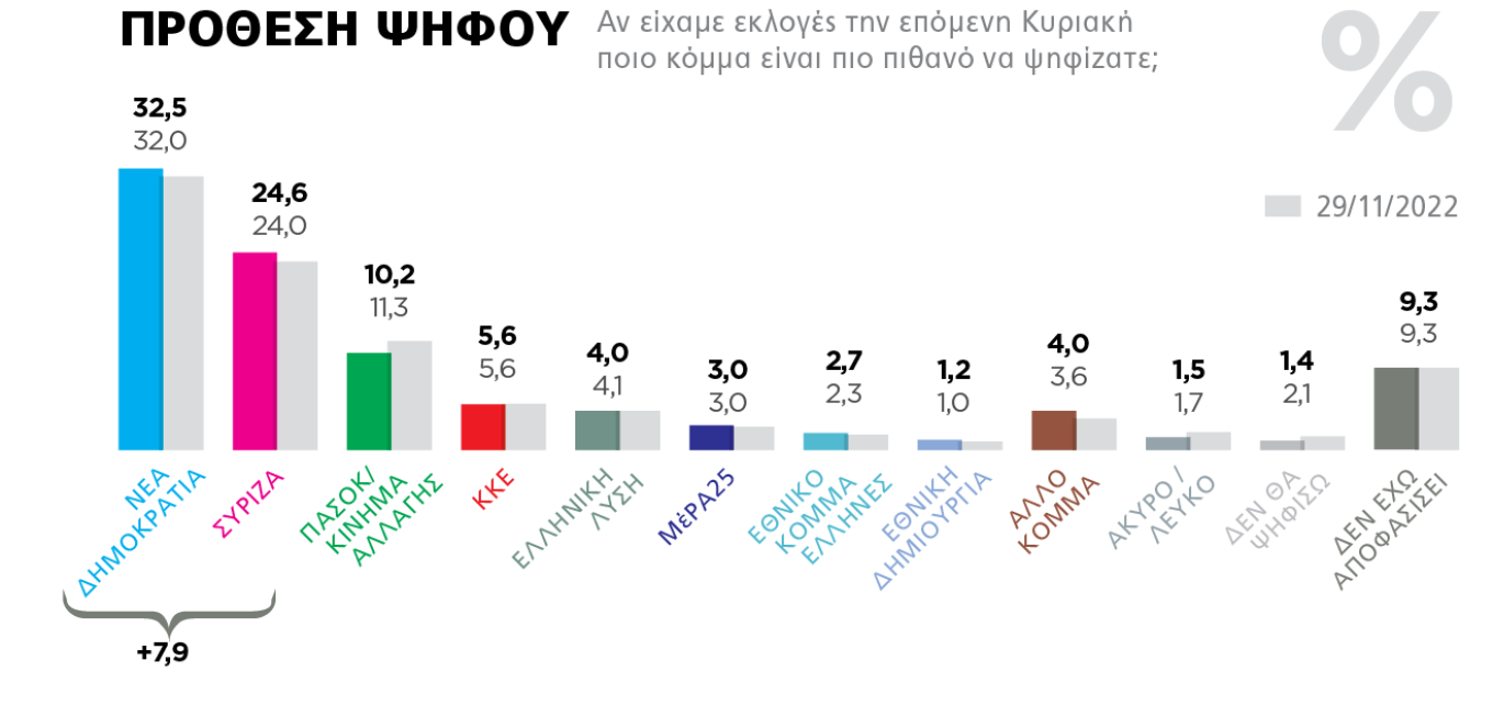 Με προβάδισμα που είναι εφάμιλλο της διαφοράς την οποία απέσπασε στις εκλογές του 2019 μπαίνει το κυβερνών κόμμα στην τελική ευθεία προς τις κάλπες, την ίδια ώρα που ο πρωθυπουργός Κυριάκος Μητσοτάκης, διατηρώντας αλώβητη την πρωτοκαθεδρία που κατέχει στους ψηφοφόρους του Κέντρου, υπερτερεί σε όλους τους τομείς του βασικού του αντιπάλου Αλέξη Τσίπρα.