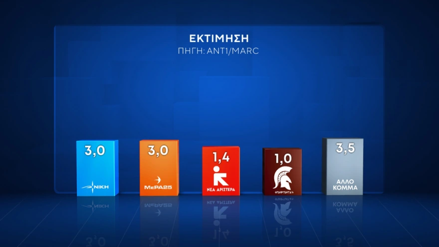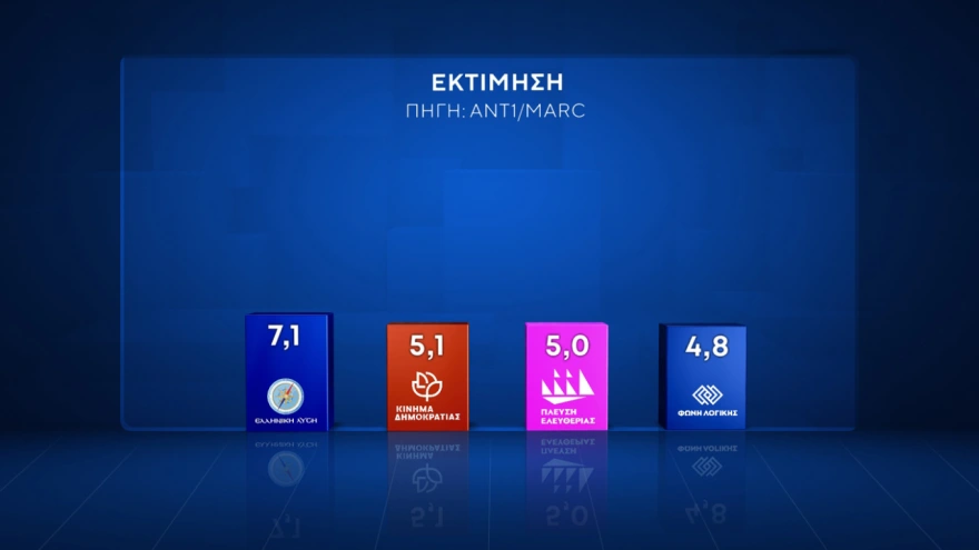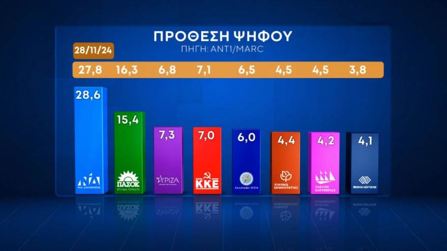 Ως προς τη σειρά κατάταξης των κομμάτων, η ΝΔ ανέρχεται στο 31,4% στην εκτίμηση ψήφου, δηλαδή με προβάδισμα 13,4 μονάδων από το ΠΑΣΟΚ που βρέθηκε στο 18%, με πτωτική πορεία στην πρόθεση ψήφου. Ακολουθεί ως τρίτο κόμμα ο ΣΥΡΙΖΑ, με 8,5% στην εκτίμηση ψήφου. Η «Ελληνική Λύση» του Κυριάκου Βελόπουλου είναι στην πέμπτη θέση, με 7,1% κάτω από το ΚΚΕ που «έγραψε» 8,2%. Από τα μικρότερα κόμματα, το κόμμα Κασσελάκη είναι στο 5,1% στην εκτίμηση ψήφου, η Πλεύση Ελευθερίας στο 5%, η Φωνή Λογικής στο 4,8%, ενώ το ΜεΡΑ25 και η Νίκη εμφανίζονται να μπαίνουν οριακά στη Βουλή με 3%, πράγμα που σημαίνει Βουλή με 10 κόμματα.
