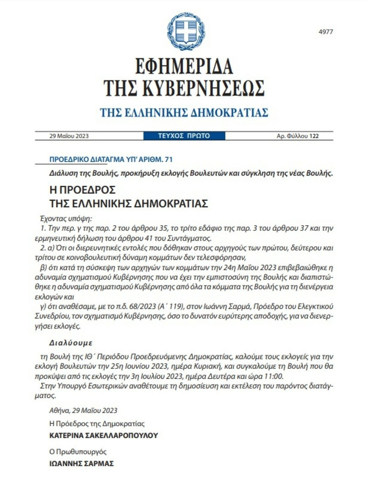 Το Προεδρικό Διάταγμα διάλυσης της Βουλής και προκήρυξης νέων εθνικών εκλογών στις 25 Ιουνίου θυροκολλήθηκε γύρω στις 4 στην κεντρική είσοδο του κοινοβουλίου.