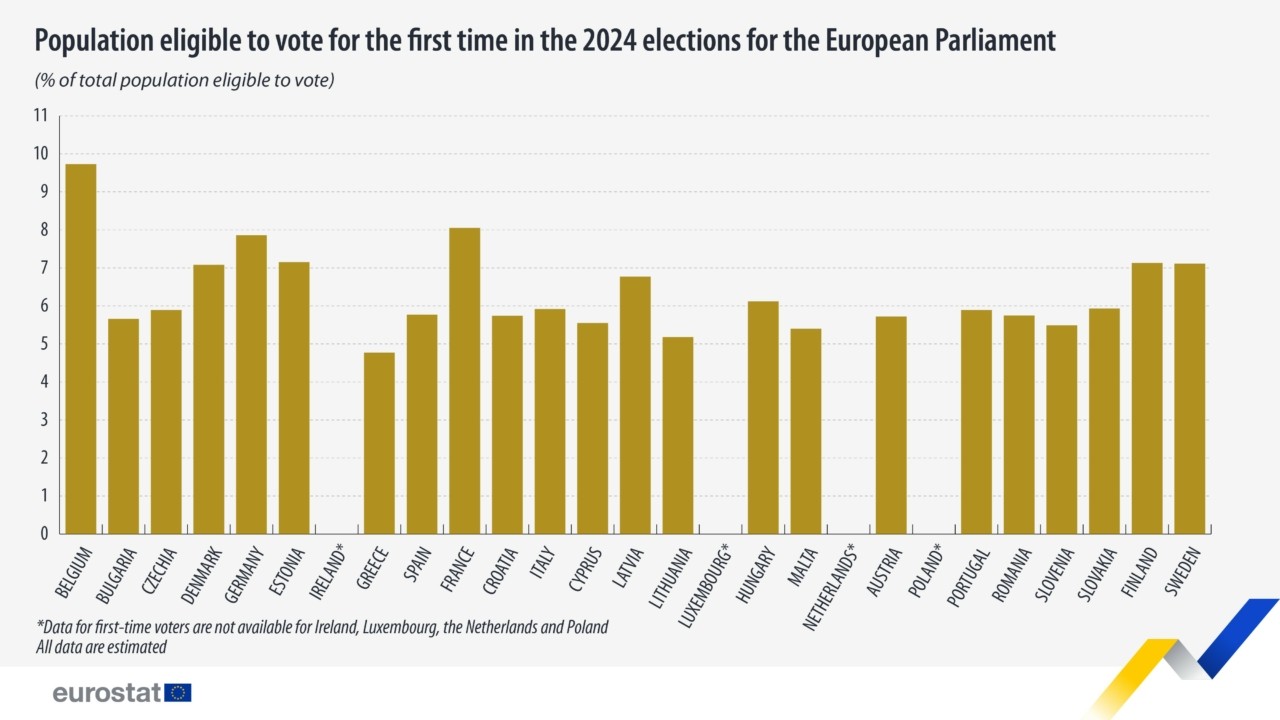 Οι εκλογές του 2024 για το Ευρωπαϊκό Κοινοβούλιο θα διεξαχθούν στις 6-9 Ιουνίου 2024. Η Eurostat ζήτησε από τις εθνικές στατιστικές υπηρεσίες των κρατών μελών της ΕΕ να συλλέξουν ειδικά στοιχεία σχετικά με τον αριθμό των ατόμων που έχουν δικαίωμα ψήφου.