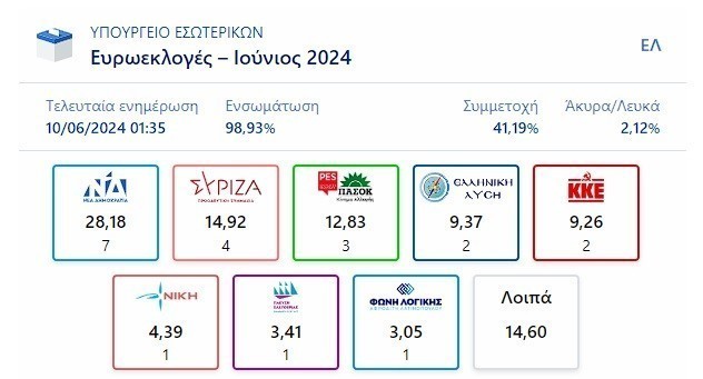 Τη νίκη της Νέας Δημοκρατίας στις ευρωεκλογές που έδειξε το exit poll επιβεβαίωσε η ροή αποτελεσμάτων από το υπουργείο Εσωτερικών.