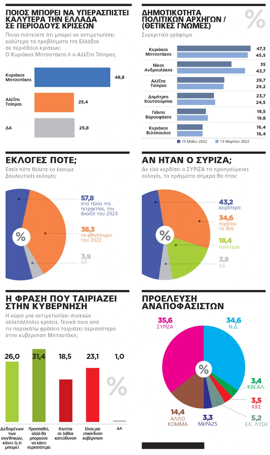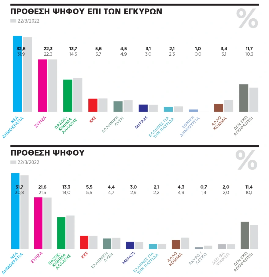 Σε διψήφια επίπεδα, της τάξης του 10,3%, επανακάμπτει το γαλάζιο προβάδισμα στην πρόθεση ψήφου, καθώς τα μέτρα του εθνικού σχεδίου για την αναχαίτιση της ενεργειακής ακρίβειας, τα οποία ανακοίνωσε τις προηγούμενες ημέρες ο πρωθυπουργός Κυριάκος Μητσοτάκης, φαίνεται ότι ενίσχυσαν έτι περαιτέρω το ηγετικό του προφίλ και την κυριαρχία του στο ευρύτερο πολιτικό σκηνικό και κυρίως στον κεντρώο χώρο βελτιώνοντας ταυτόχρονα και την εικόνα της κυβέρνησής του.