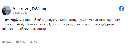 «Αναλαμβάνω πρωτοβουλία συγκέντρωσης υπογραφών για να πείσουμε τον πρόεδρο, Αλέξη Τσίπρα να είναι ξανά υποψήφιος πρόεδρος αναλογιζόμενος το καλό και το μέλλον του τόπου», αναφέρει στην πρώτη του ανάρτηση.