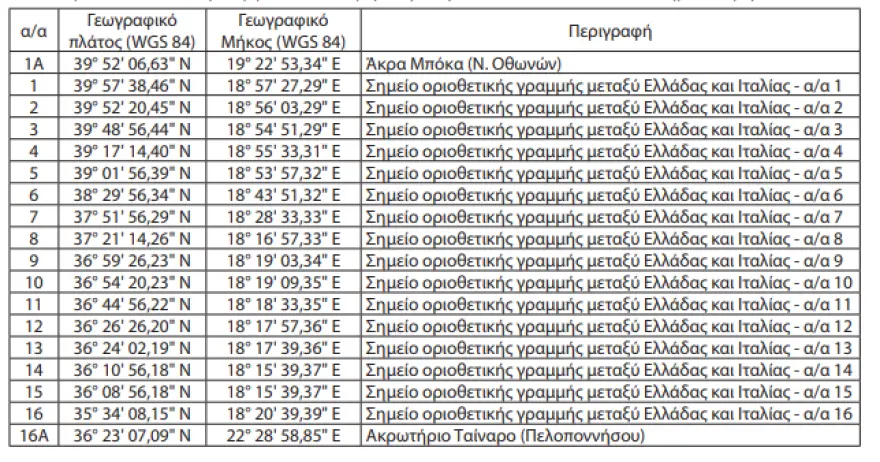 2. Η θαλάσσια περιοχή της παρ. 1 ορίζεται από γραμμές, οι οποίες συνδέουν τα εξής σημεία, όπως αυτά καθορίζονται στο Γεωδαιτικό Σύστημα Αναφοράς «WGS-84»: