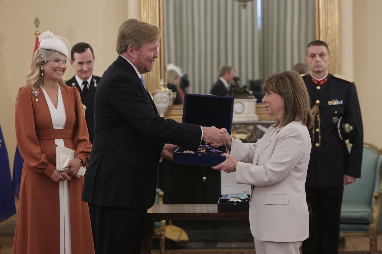 Νωρίτερα, η Πρόεδρος της Δημοκρατίας, σε ειδική τελετή στο Προεδρικό Μέγαρο, απένειμε στον Βασιλιά και στη Βασίλισσα της Ολλανδίας το Παράσημο του Μεγαλόσταυρου του Τάγματος του Σωτήρος.