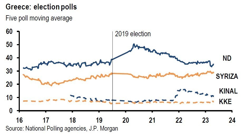 Η Ελλάδα πραγματοποιεί πρόωρες εκλογές στις 21 Μαΐου, οι οποίες θα διεξαχθούν με το σύστημα της απλής αναλογικής με όριο για την είσοδο στη Βουλή στο 3%). Ο νόμος ψηφίστηκε από την προηγούμενη αριστερή κυβέρνηση του ΣΥΡΙΖΑ το 2016. Σύμφωνα με τις πρόσφατες δημοσκοπήσεις, η κεντροδεξιά κυβέρνηση της Νέας Δημοκρατίας (35%) κατέχει σταθερό προβάδισμα 6% – 6,5% έναντι του αριστερού και λαϊκίστικού ΣΥΡΙΖΑ (29%), με το κεντροαριστερό ΠΑΣΟΚ/ΚΙΝΑΛ να συγκεντρώνει περίπου 10,5% και το κομμουνιστικό κόμμα ΚΚΕ 6,5% περίπου. Δύο άλλα λαϊκίστικα κόμματα, το αντιευρωπαϊκό και αριστερό ΜέΡΑ-25 και το δεξιό Ελληνική Λύση, θα μπορούσαν να εισέλθουν στο κοινοβούλιο, με τα δύο να συγκεντρώνουν ποσοστά κοντά στο 4,5%.