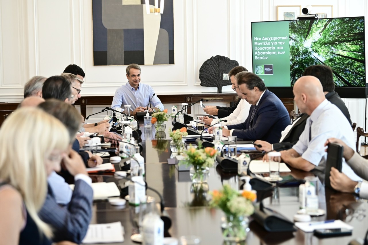 Ευρεία σύσκεψη στο Μέγαρο Μαξίμου με τη συμμετοχή της ηγεσίας των υπουργείων Ενέργειας και Περιβάλλοντος και Κλιματικής Κρίσης και Πολιτικής Προστασίας για την άμεση ανάπλαση των καμένων περιοχών σε Έβρο και Πάρνηθα.