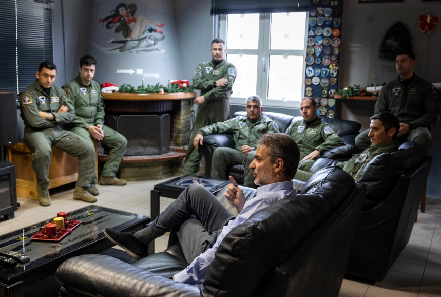 Στη συνέχεια, επισκέφθηκε την 343 Μοίρα, όπου τον υποδέχτηκαν οι πιλότοι και του προσέφεραν αναμνηστικά δώρα. Ο Κυριάκος Μητσοτάκης συνομίλησε με το προσωπικό και αντάλλαξε ευχές ενόψει της νέας χρονιάς, ευχαριστώντας για τις πολύτιμες υπηρεσίες που προσφέρει.