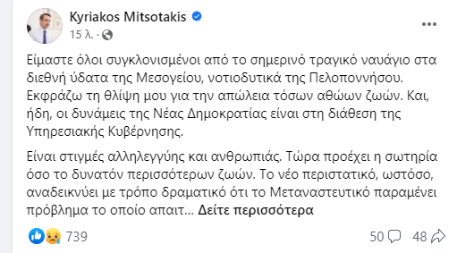 «Είμαστε όλοι συγκλονισμένοι από το σημερινό τραγικό ναυάγιο στα διεθνή ύδατα της Μεσογείου, νοτιοδυτικά της Πελοποννήσου. Εκφράζω τη θλίψη μου για την απώλεια τόσων αθώων ζωών. Και, ήδη, οι δυνάμεις της Νέας Δημοκρατίας είναι στη διάθεση της Υπηρεσιακής Κυβέρνησης.