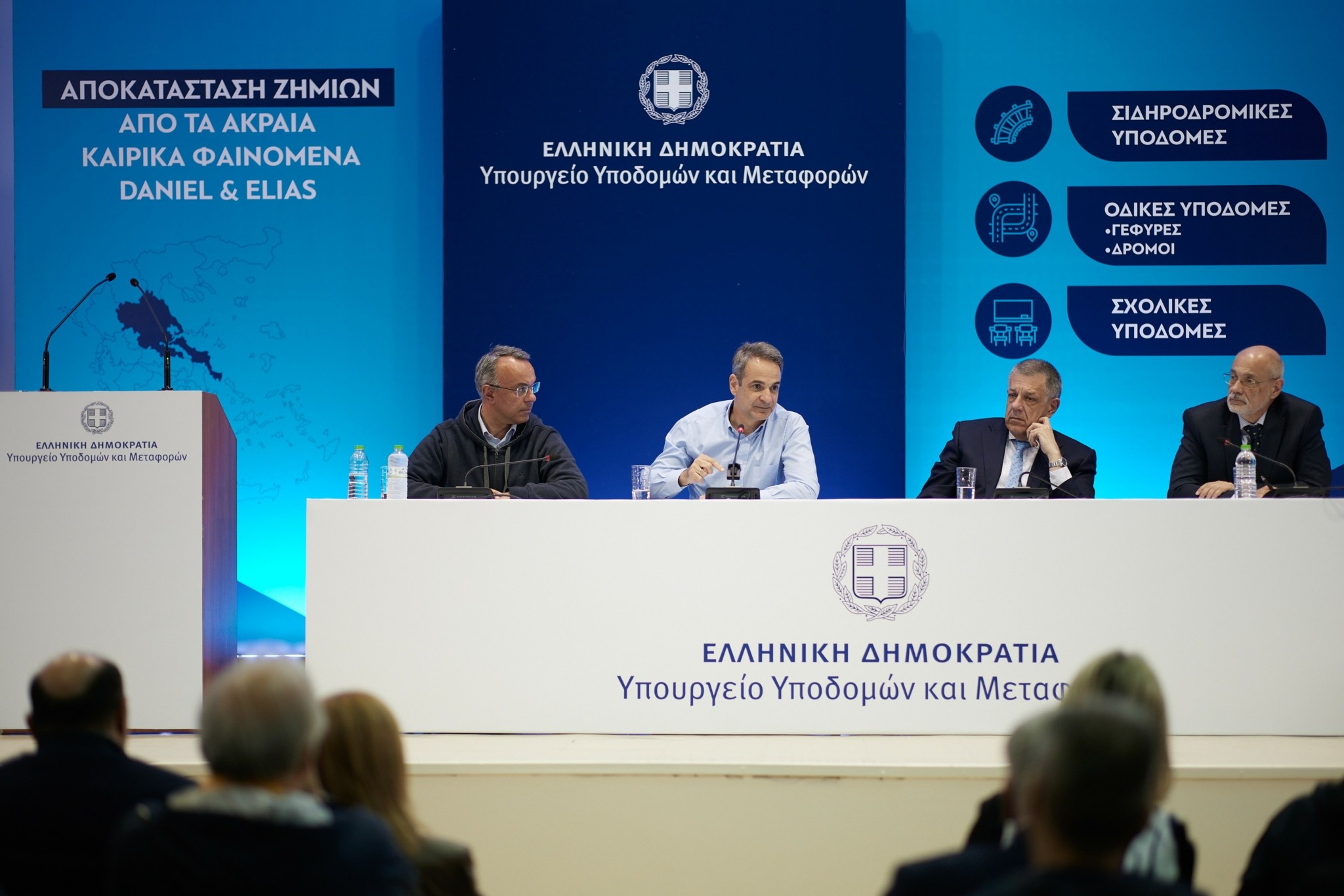 «Η συνολική αποκατάσταση των ζημιών του “Daniel” και του “Elias” θα ξεπεράσει τα 3 δισεκατομμύρια ευρώ. Από αυτά, τα 1,4 δισεκατομμύρια αφορά μόνο τις οδικές, τις σιδηροδρομικές υποδομές, καθώς και την αποκατάσταση των σχολείων μας» τόνισε μεταξύ άλλων ο πρωθυπουργός, ο οποίος ευχαρίστησε την ηγεσία και τα στελέχη του Υπουργείου Υποδομών για το κοστολογημένο έργο που παρουσίασαν, καθώς και «την Ένωση Ελλήνων Εφοπλιστών και ειδικά την Πρόεδρό της, την κα Μελίνα Τραυλού, για την ταχύτητα με την οποία ανταποκρίθηκε στο αίτημά μου να συνδράμει η εφοπλιστική κοινότητα στη μεγάλη εθνική προσπάθεια χρηματοδότησης της ανάταξης της Θεσσαλίας».