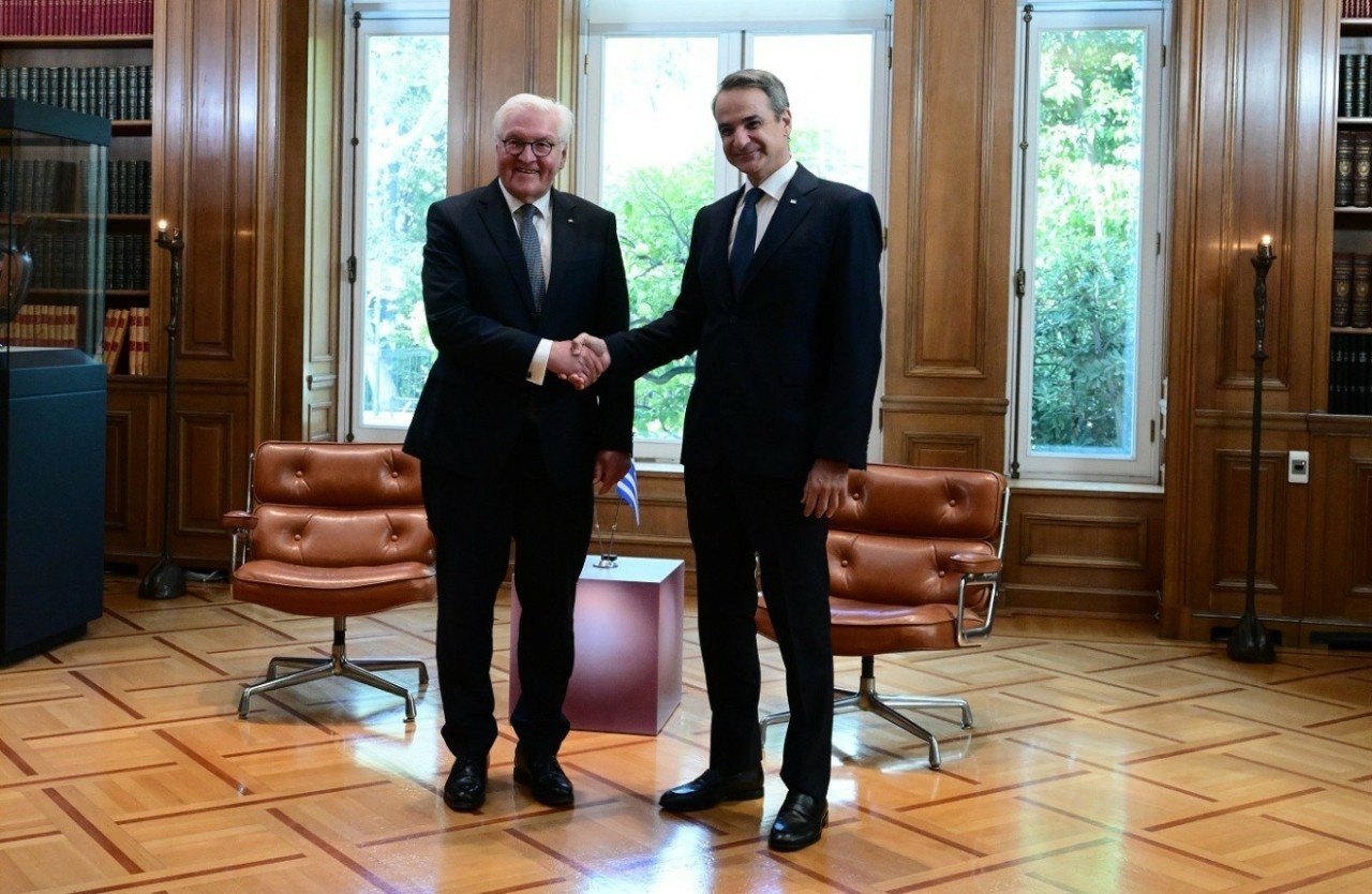 Με τον πρόεδρο της Γερμανίας, Φρανκ Βάλτερ Σταϊνμάιερ συναντήθηκε ο Κυριάκος Μητσοτάκης στο Μέγαρο Μαξίμου, με τον πρωθυπουργό να λέει «για την Ελλάδα το ζήτημα των επανορθώσεων και ειδικά το αναγκαστικό κατοχικό δάνειο, αυτά τα ζητήματα είναι ακόμα πολύ ”ζωντανά” και ελπίζουμε ότι κάποια στιγμή θα τα επιλύσουμε».