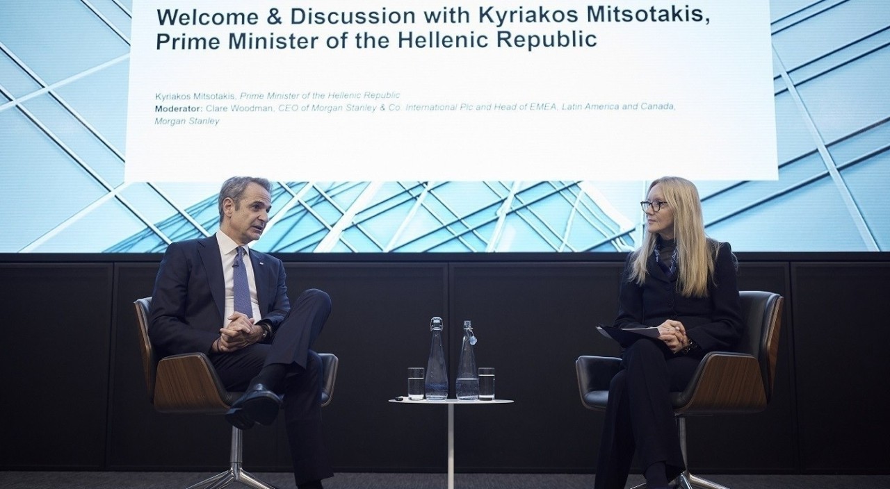 O Πρωθυπουργός Κυριάκος Μητσοτάκης συμμετείχε σε συζήτηση με την Clare Woodman, επικεφαλής της Morgan Stanley για την Ευρώπη, τη Μέση Ανατολή και την Αφρική (ΕΜΕΑ), τη Λατινική Αμερική και τον Καναδά, και Διευθύνουσα Σύμβουλο της Morgan Stanley & Co. International, στο πλαίσιο του Ελληνικού Επενδυτικού Συνεδρίου, που συνδιοργανώνουν η Morgan Stanley και το Χρηματιστήριο Αθηνών στο Λονδίνο.